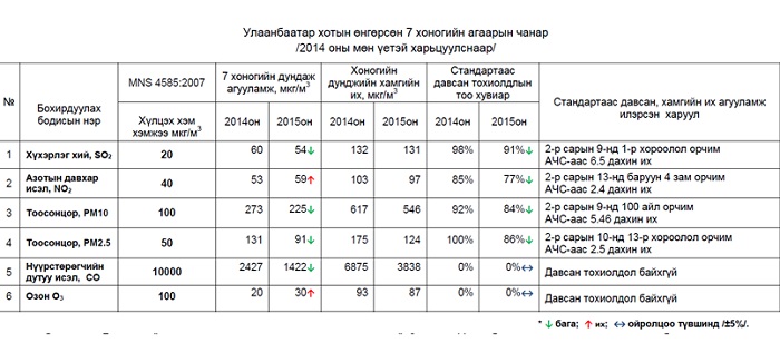 Агаарын чанарын албанаас мэдээлснээр нийслэлийн хүхэрлэг хий (SO2), РМ10 болон РМ2.5 тоосонцор, нүүрстөрөгчийн дутуу исэл (CO) өмнөх оны мөн үеэс буурсан, азотын давхар исэл (NO2) өмнөх оны мөн үеэс нэмэгдсэн байна.