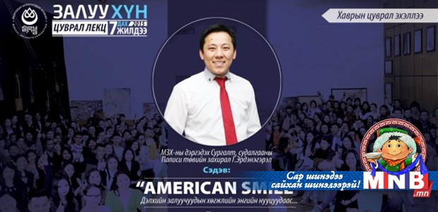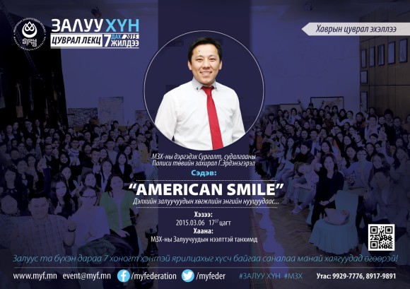 Монголын Залуучуудын Холбооноос уламжлал болгон зохион байгуулагдаж ирсэн “Залуу хүн” цуврал лекц долоо дахь жилдээ тасралтгүй үргэлжилж ирэх гуравдугаар сарын 06-наас эхлэх гэж байна. 2015 оны “Залуу хүн” цуврал лекцийн анхны салхийг МЗХ-ны дэргэдэх Сургалт, судалгааны Полиси төвийн захирал Г.Эрдэнэгэрэл хагалахаар боллоо. Тэрээр “Аmerician Smile” гэсэн сэдвээр лекц унших бөгөөд дэлхийн залуучуудын хөгжлийн орчин үеийн чиг хандлагын талаар залуустайгаа ярилцах гэнэ.