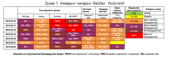 Энэ сарын 16-наас 22-ны өдрүүдэд Нийслэлийн гэр хороолол, авто замын орчимд агаарын бохирдол “их”, “дунд” зэргийн бохирдолтой, орон сууцны хороолол орчмоор “дунд” болон “бага” зэргийн бохирдолтой байжээ.