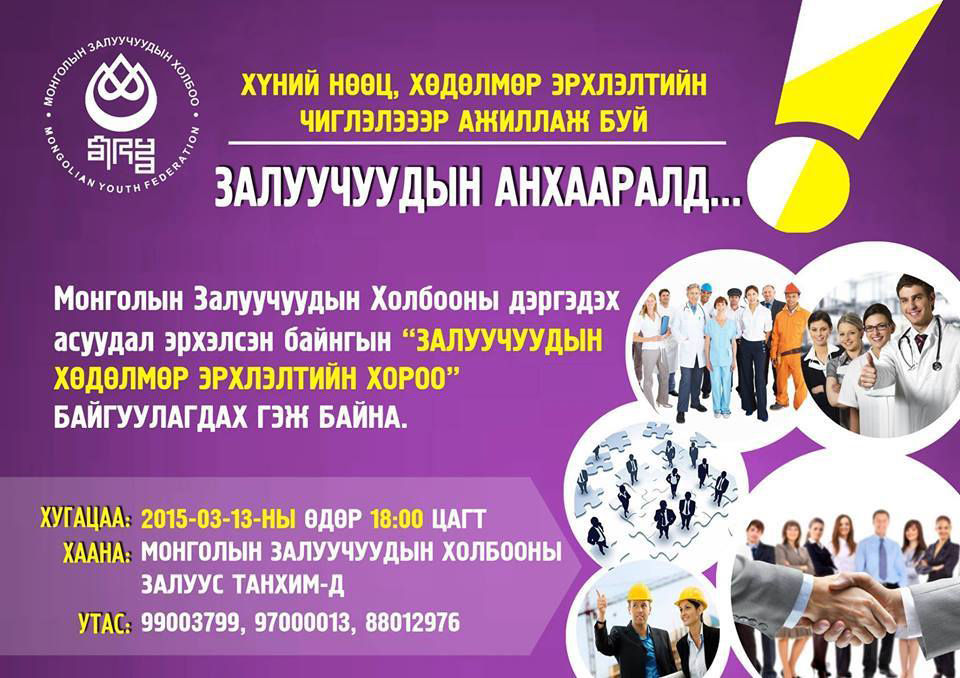 Залуучуудын хөдөлмөр эрхлэлтийн асуудал бол нийгэмд залуучуудын өмнө тулгамдаад буй томоохон асуудлуудын нэг юм. Монголын залуучуудын холбоо залуучуудын хөдөлмөр эрхлэлтийг нэмэгдүүлэх зорилгоор “Залуучуудын хөдөлмөрийн төв бирж”-ийг байгуулан 2013 оноос идэвхитэй үйл ажиллагаа явуулж байгаа билээ. Залуучуудын Хөдөлмөрийн Төв бирж нь оюутан, залуучуудын хөдөлмөр эрхлэлтийг нэмэгдүүлэхэд чиглэсэн шинэ ажлыг санаачлан хэрэгжүүлж, Монгол Улсын хэмжээнд залуучуудын ажилгүйдэлд эзлэх хувийг бууруулах зорилгоор цагийн болон байнгын ажлын байранд зуучлах, сургалт зөвлөгөө өгөх, хөдөлмөрт бэлтгэх, төсөл хөтөлбөр хэрэгжүүлэх зэрэг ажлуудыг зохион байгуулан ажиллаж байна.