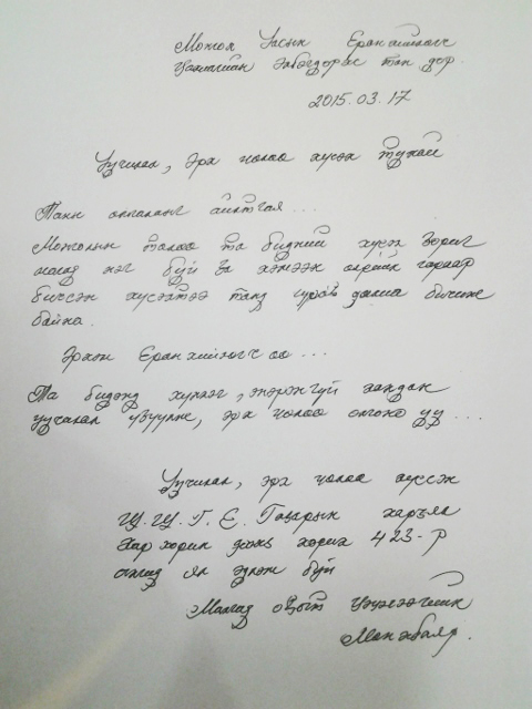 Тэд энэ талаар “Ц.Мөнхбаяр Ерөнхийлөгчөөс уучлал хүссэн өргөдлийг хоёр удаа илгээсэн. Өнгөрсөн онд өөрийн гараар бичсэн өргөдлөө Шүүхийн шийдвэр гүйцэтгэх байгууллагаар дамжуулан хүргүүлсэн. Гэтэл үүнийг Ерөнхийлөгч мэдээгүй гэж хэвлэл мэдээлэлд өгсөн ярилцлагадаа хэлсэн байна. Ерөнхийлөгчид хандсан хоёр захидлыг тэр хүн мэдээгүй байна гэхээр үүнд Ерөнхийлөгчийн Тамгын газар хайнга хандсан гэж үзэж байна. Энэ бүгдийг эргэн харж, Ц.Мөнхбаяр болон Д.Төмөрбаатар, Г.Болдбаатар нарт уучлал үзүүлээсэй гэж хүсэж байна” хэмээсэн юм.