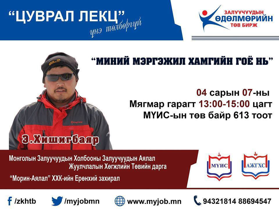 “Миний мэргэжил хамгийн гоё нь” цуврал лекц үргэлжилсээр байна. Цуврал лекцийн дөрөв дэх дугаарт МЗХ-ны Залуучуудын Аялал Жуулчлалын Хөгжлийн Төвийн дарга, “Морин-Аялал” ХХК-ий ерөнхий захирал Э.Хишигбаяр оролцож өөрийн арвин туршлагаа залуустай хуваалцах юм. Аялал жуулчлалын хөтөч, менежер гэдэг мэргэжил бол эх орон, байгаль дэлхийнхээ бахдам сайхныг хүмүүст сурталчилан таниулж, улсын эдийн засагт үнэтэй хувь нэмэр оруулдаг бахархам мэргэжил юм.