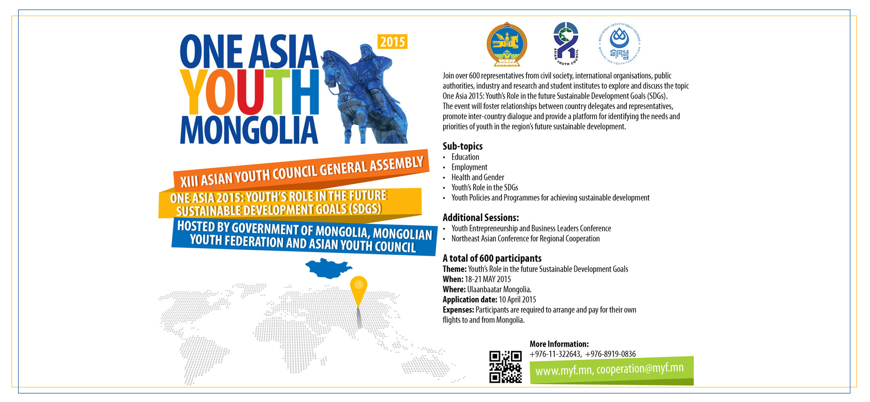 Монгол Улсын Засгийн Газар, Азийн Залуучуудын Зөвлөл, Монголын Залуучуудын Холбоо хамтран зохион байгуулж буй Азийн залуучуудын зөвлөлийн XIII Ерөнхий Чуулганы хүрээнд Зүүн Хойд Азийн Залуучуудын симпиозиумыг тавдугаар сарын 20-ны өдөр зохион байгуулахаар болжээ. МЗХ-ны Ерөнхийлөгч А.Мөнхбат 2014 оны 12-р сард Албани Улсын Тирана хотноо хуралдсан Дэлхийн Залуучуудын Ассемблейн 16-р чуулганы үеэр 2014-2018 оны хугацаанд Азийн асуудал хариуцсан Дэд ерөнхийлөгчөөр сонгогдож ажиллахаар болсон билээ.Иймд МЗХ-ны Ерөнхийлөгч А.Мөнхбат нь Зүүн Хойд Азийн залуучуудын асуудлыг шийдвэрлэхэд өөрсдийн хувь нэмрийг оруулах нь зүйтэй гэж үзсэн тул уг уулзалтыг Монгол Улсад зохион байгуулах санаачлагыг гаргасан юм.