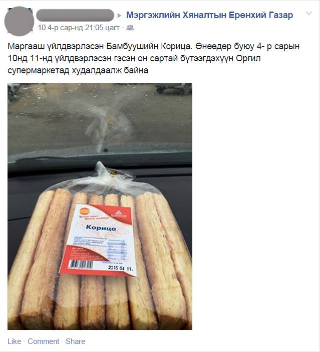 МХЕГ-ын фэйсбүүк хаягаар хаяг шошгын зөрчилтэй бүтээгдэхүүний талаар нэгэн хэрэглэгчээс ирүүлсэн мэдээллийн дагуу Хан-Уул дүүргийн Мэргэжлийн хяналтын хэлтсээс шалгалт хийжээ. Энэ сарын 10-ны өдөр “Оргил супермаркет”-аас худалдаж авсан “Бамбууш” компанийн “Корица” нэрийн гурилан бүтээгдэхүүн энэ сарын 11 өдөр үйлдвэрлэгдсэн гэсэн тэмдэглэгээтэй байсныг худалдан авагч ийнхүү мэдээлсэн юм.