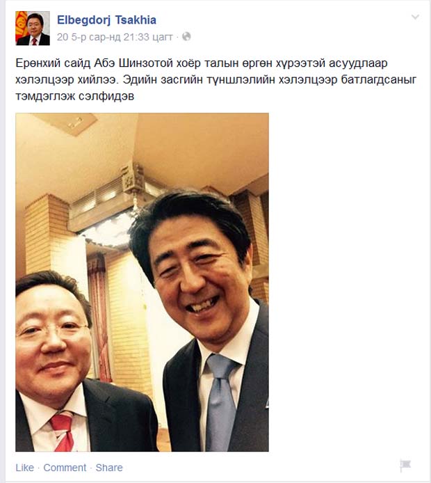 Дэлхийн нэр хүнд бүхий улстөрчид селфичдийн эгнээд багтаж, албан ёсны үйл ажиллагааны үеэр хамт селфидэх болсон. Энэ шинэ "зан үйл" манай улсын ерөнхийлөгчид ч таалагдсан бололтой. Тэрээр өнгөрсөн долоо хоногт манай улсад төрийн айлчлал хийсэн Бүгд Найрамдах Энэтхэг Улсын Ерөнхий сайд Нарендра Модтай анхны селфигээ хийж байсан бол саяхан Япон улсын Ерөнхий сайд Шинзо Абэтэй албан ёсны хэлэлцээр хийх үеэрээ селфидэж амжжээ.