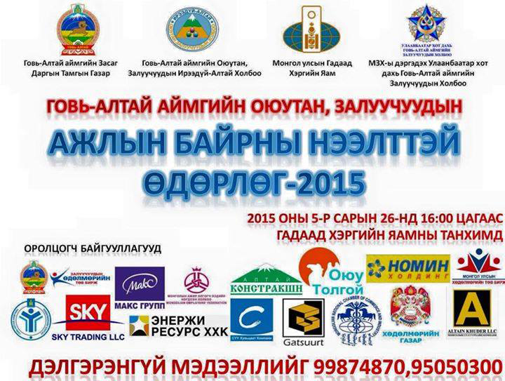 Энэ жилийн хувьд Монгол Улсын Засгийн газрын гишүүн Монгол Улсын Гадаад Хэргийн сайд Лүндэгийн Пүрэвсүрэнгийн дэмжлэгээр 2015 оны тавдугаар сарын 26-ны өдөр 16:00 цагт Гадаад Хэргийн Яаманд "Ажлын байрны нээлттэй өдөрлөг-2015" нэртэйгээр Говь-Алтай аймгийн нийт оюутан, залуучууд, төгсөгчдөд зориулан зохион байгуулах гэж байна. Тус өдөрлөгт одоогоор шилдэг 200 төгсөгч, 30 топ аж ахуйн нэгж компаниуд оролцохоо мэдэгдээд байгаа бөгөөд оролцохыг хүссэн аж ахуйн нэгж пүүс компаниудад ч нээлттэй аж.