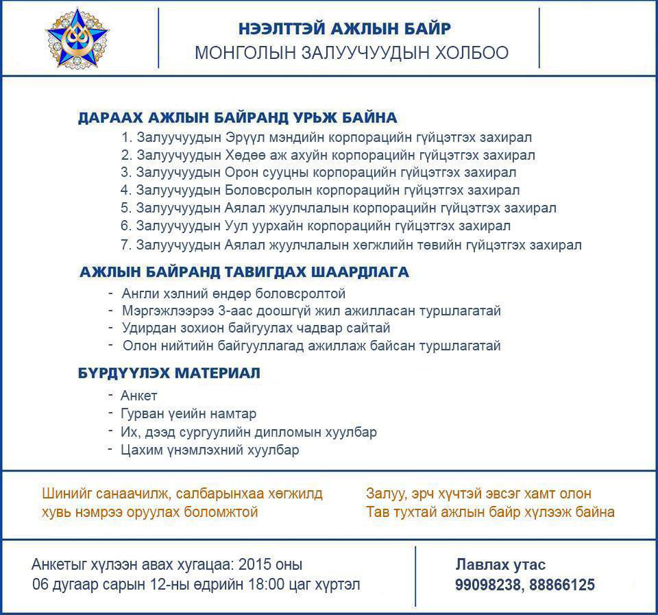 Монголын Залуучуудын Холбоо нь 12 жил завсарласан V Их хурлаа өнгөрсөн гуравдугаар сарын 28–ны өдөр хуралдуулж үндсэн дүрэмдээ өөрчлөлт оруулж, хэтийн зорилтоо дэвшүүлсэн. Тус хуралдаанаар монгол залуу хүн бүрийн өмнө тулгамдаж буй асуудлыг шийдвэрлэх үүднээс тус холбоо дэргэдээ корпораци байгуулахаар болсон юм. Тодруулбал, Залуучуудын Эрүүл мэндийн корпораци,Залуучуудын Хөдөө аж ахуйн корпораци, Залуучуудын орон сууцны корпораци, Залуучуудын Боловсролын корпораци, Залуучуудын Аялал жуулчлалын корпораци, Залуучуудын Уул уурхайн корпораци, Залуучуудын Аялал жуучлал хөгжлийн төвийн корпорацийг байгуулж ажиллахаар тогтсон. Иймд дээрх долоон корпораци дээр гүйцэтгэх захирлын нээлттэй сонгон шалгаруулалт явагдаж байгаа юм байна. Хэрэв та мэргэжлээрээ 3-аас доошгүй жил ажилласан туршлагатай, Англи хэлний өндөр боловсролтой, Удирдан зохион байгуулах чадвартай, Олон нийтийн байгууллагад ажиллаж байсан туршлагатай бол МЗХ-ны санал болгож буй энэхүү ажилд өөрийгөө сориод үзээрэй.
