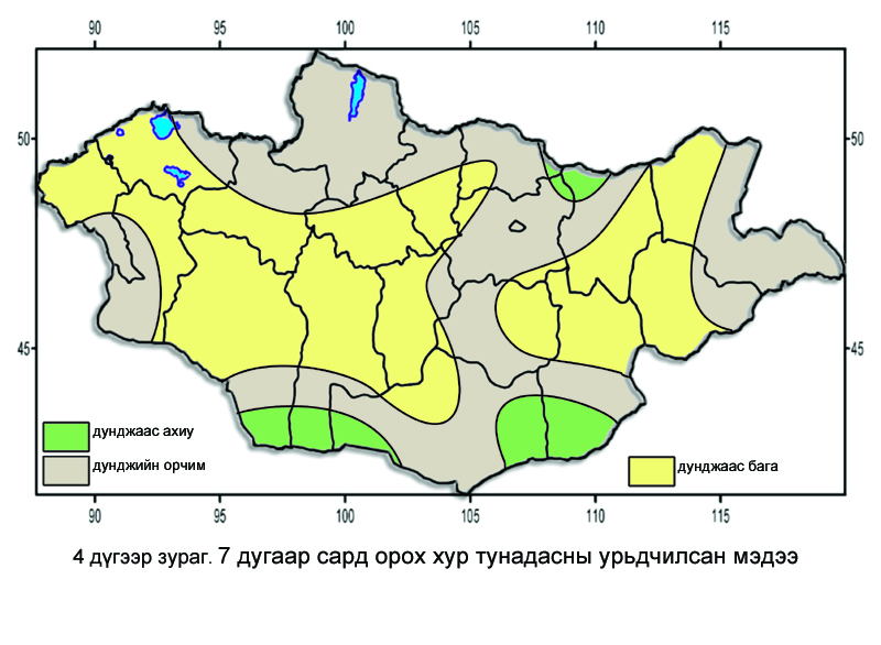 Энэ сард орох тунадасны нийлбэр хэмжээ нь Архангай, Өвөрхангайн ихэнх нутаг, Булганы өмнөд, Сэлэнгийн баруун өмнөд хэсгээр олон жилийн дунджаас бага, бусад нутгаар олон жилийн дунджийн орчим бороо орох төлөвтэй.