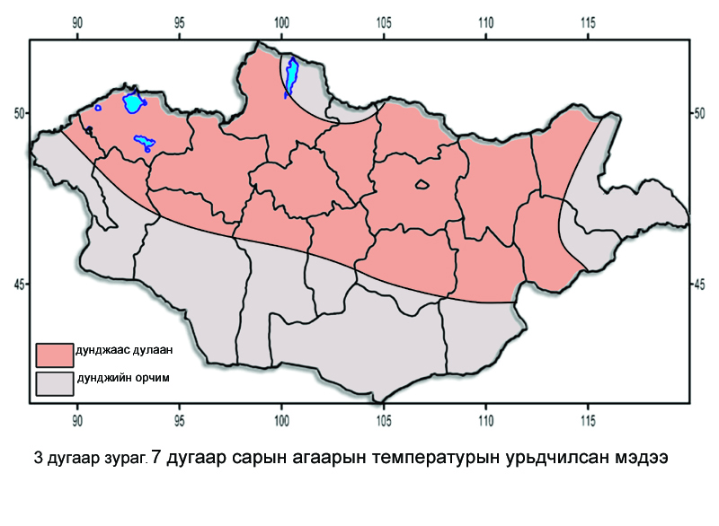 Төвийн нутаг. Агаарын температурын сарын дундаж нь нутгийн баруун хэсгээр 12-17 хэм, бусад нутгаар 17-22 хэм дулаан буюу Хөвсгөлийн зүүн, Булганы хойд хэсгээр олон жилийн дунджийн орчим, бусад нутгаар олон жилийн дунджаас 0.5-1.0 хэмээр дулаан байх төлөвтэй.