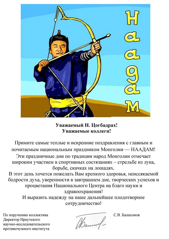 Зоонозын өвчин судлалын үндэсний төвийнхөнд ОХУ-ын Эрхүү хот дахь Сибирь, Алс Дорнодын тарваган тахал судлалын эрдэм шинжилгээний хүрээлэнгийн хамт олноос мэндчилгээ ирүүлжээ. Мэндчилгээг Тулгар Төрийн 2224 жил, Их Монгол Улсын 809 жил, Ардын хувьсгалын 94 жилийн ой, Үндэсний Их Баяр наадмыг тохиолдуулан дэвшүүлсэн байна.