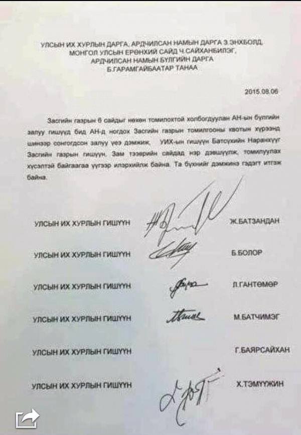 Засгийн газрын томилгооны квотын хүрээнд шинэ залуу үеэ дэмжиж Б.Наранхүүг сайдад нэр дэвшүүлэхийг хүссэн албан бичигт Ж.Батзандан, Б.Болор, Л.Гантөмөр, М.Батчимэг, Х.Тэмүүжин нар гарын үсэг зуржээ.