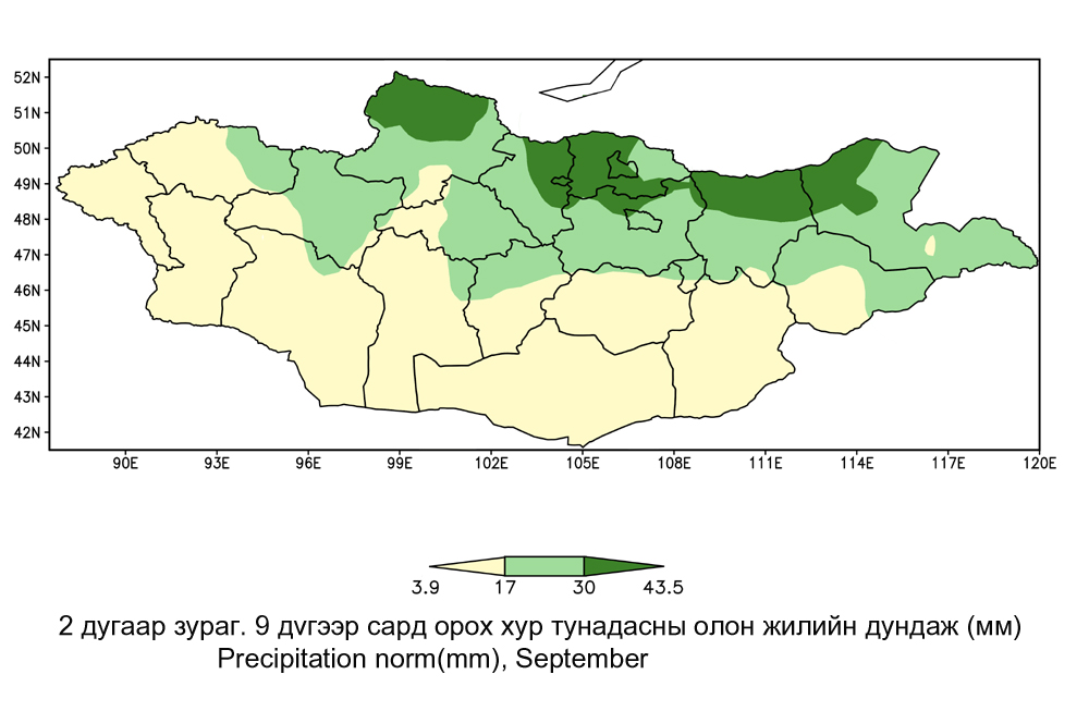 Энэ сард ордог хур тунадасны хэмжээ наймдугаар сарынхтай харьцуулахад эрс багасч баруун ба говийн ихэнх нутгаар 4-9 мм, харин баруун зүгийн нутгийн зүүн хойд хэсэг болон төв ба зүүн зүгийн