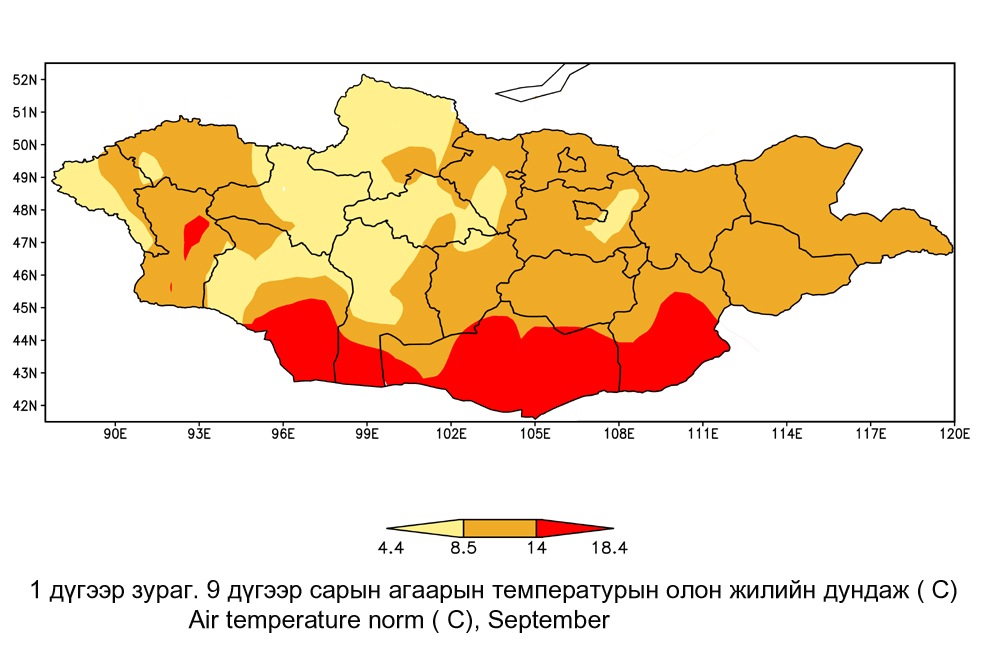 Есдүгээр сарын агаарын дундаж температур Их нууруудын хотгор, Алтайн өвөр говь болон говийн нутгийн өмнөд хэсгээр 14-19 хэм, Алтай, Хангай, Хөвсгөл, Хэнтийн уулархаг нутгаар 4-9 хэм, бусад нутгаар 8-13 хэм дулаан байдаг.