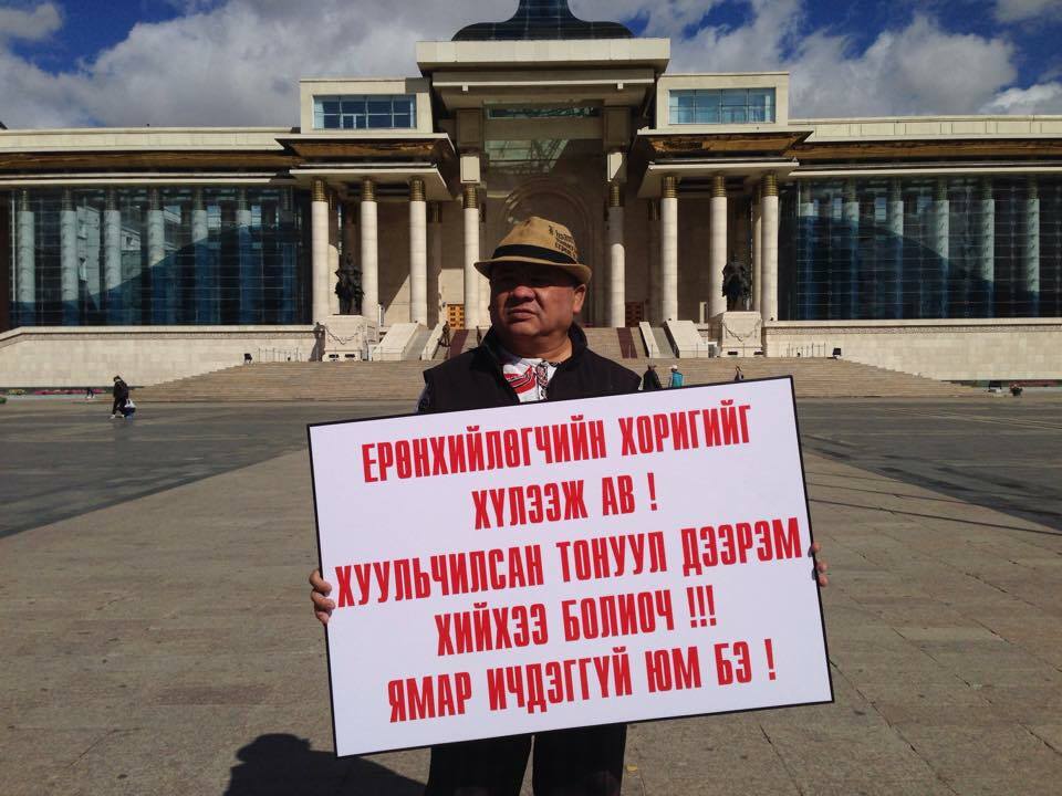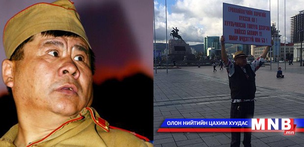 Яг одоо Чингисийн талбайд МУГЖ Б.Батзаяа “Ерөнхийлөгчийн хориг”-ийг хүлээн авч, хэрэгжүүлэхийг шаардаж, лоозон барин зогсож байна. Тэрбээр лоозондоо “Ерөнхийлөгчийг хоригийг хүлээж ав. Хуульчилсан тонуул дээрэм хийхээ болиоч. Ямар ичдэггүй юм бэ” хэмээн бичжээ.
