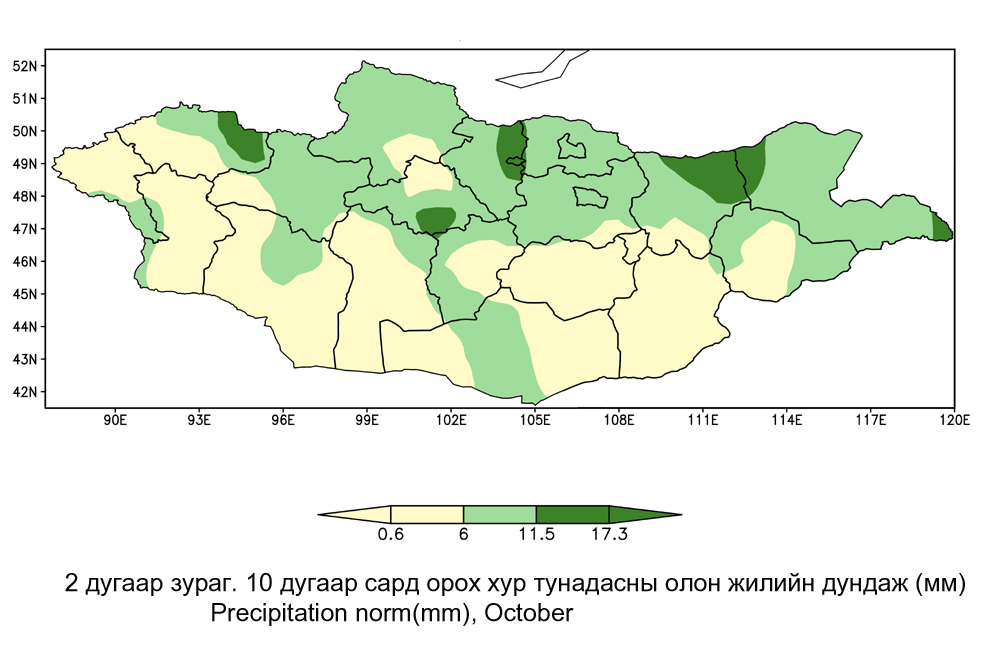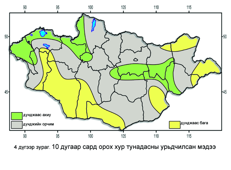 Энэ сард Хөвсгөл, Архангайн баруун, Өвөрхангайн зүүн хойд, Төв аймгийн өмнөд хэсгээр олон жилийн дунджаас ахиу, бусад нутгаар дунджийн орчим хур тунадас орох төлөвтэй /4 дүгээр зураг/.