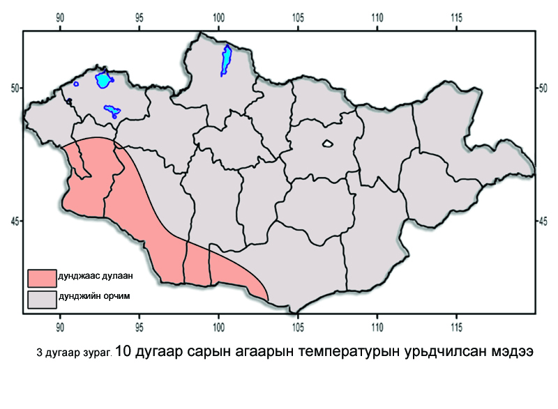 Зүүн зүгийн нутаг. Агаарын температурын сарын дундаж нь бүх нутгаар 0-5 хэм дулаан буюу бүх нутгаар олон жилийн дунджийн орчим байна /3 дугаар зураг/.