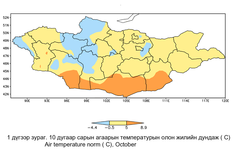 10 дугаар сарын агаарын температурын дундаж нь олон жилийн \1981-2010 оны\ дунджаар Алтай, Хангай, Хэнтэйн нуруу, Хөвсгөлийн уулсаар 0-4 хэм хүйтэн, Алтайн чанад говь болон говийн нутгаар 4-9 хэм дулаан, бусад нутгаар 0-4 хэм дулаан байдаг.