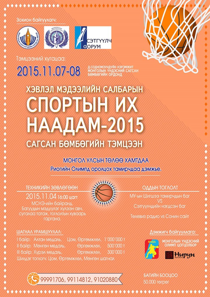 Хэвлэл мэдээллийн салбарын "Спортын их наадам-2015" сагсан бөмбөгийн тэмцээн 11 дүгээр сарын 7-8-нд болно. Тус наадмын техникийн зөвлөгөөний хурал 2015 оны 11 дүгээр сарын 4-ний өдрийн 16:00 цагт Монгол Сэтгүүлчдийн нэгдсэн эвлэлийн байранд болох тов гарсан байна. Багуудын мэдүүлгийг mseonline@yahoo.com хаягаар болон МСНЭ-ийн байранд авч байгаа юм.