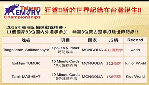 Өнгөрсөн амралтын өдрүүдэд Тайванийн ой тогтоолтын ОУ-ын тэмцээн дээр шинэчлэгдсэн Дэлхийн Рекордууд
