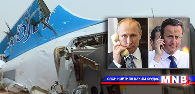 Их Британийн ерөнхий сайд Дэвид Кэмерон, ОХУ-ын ерөнхийлөгч Владимир Путин нар утсаар ярьжээ. Хоёр орны удирдагчид өнгөрсөн долоо хоногт Египетийн Синайн хойгт сүйрсэн Оросын онгоцны осолтой холбоотой асуудал хөндсөн байна.