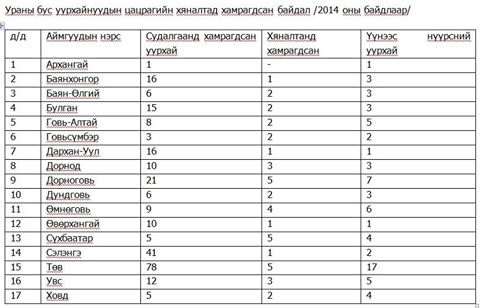 336 ураны бус уурхайгаас нүүрсний 35, жоншны 12, төмрийн 8, алт, мөнгөний 6, зэс, молибдены 3, вольфрамын 2, барилгын материал, ачаа тээврийн 5, нийт 71 аж ахуйн нэгж, байгууллага хяналт шинжилгээнд хамрагдсан байна. Хяналт шинжилгээний дүнг Мэргэжлийн хяналтын ерөнхий газрын Дэд даргын зөвлөлийн 2015 оны 12 дугаар сарын 04-ний өдрийн хурлаар хэлэлцэн шийдвэр гаргалаа.