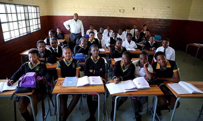 Совето дүүргийн Секано-Нтоане сургуулийн 11-р ангийн сурагчид багш Региналд Сихваригийн хамт
