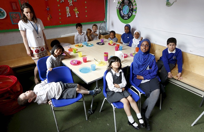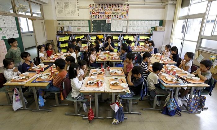 Такиногава бага сургуулийн сурагчид үдийн хоолны өмнө залбирал үйлдэж буй байдал