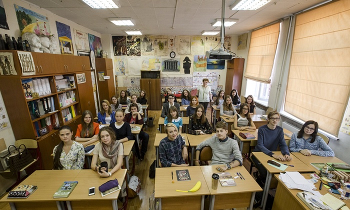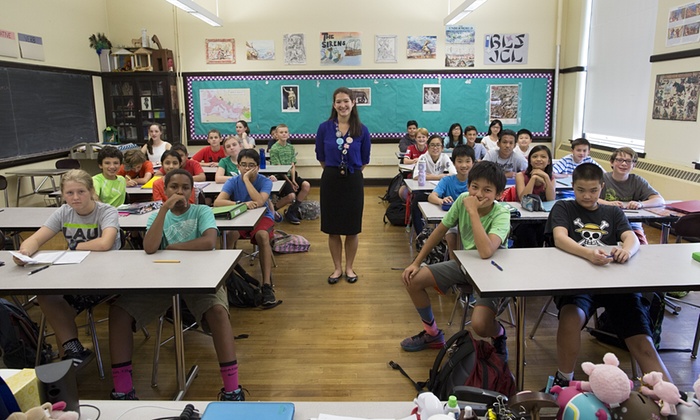 1635 онд байгуулагдсан, АНУ-ын анхны улсын сургууль болох Бостон Латин сургууль. 7-р ангийн сурагчид багш Элизабет Могуэлийн хамт.