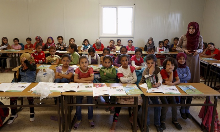 Дайн, зэвсэгт мөргөлдөөний уршгаар эх орноосоо дайжиж гарсан дүрвэгч хүүхдүүд сурдаг Заатари дүрвэгсдийн хуаран дахь ЮНИСЕФ-ийн сургуулийн сурагчид