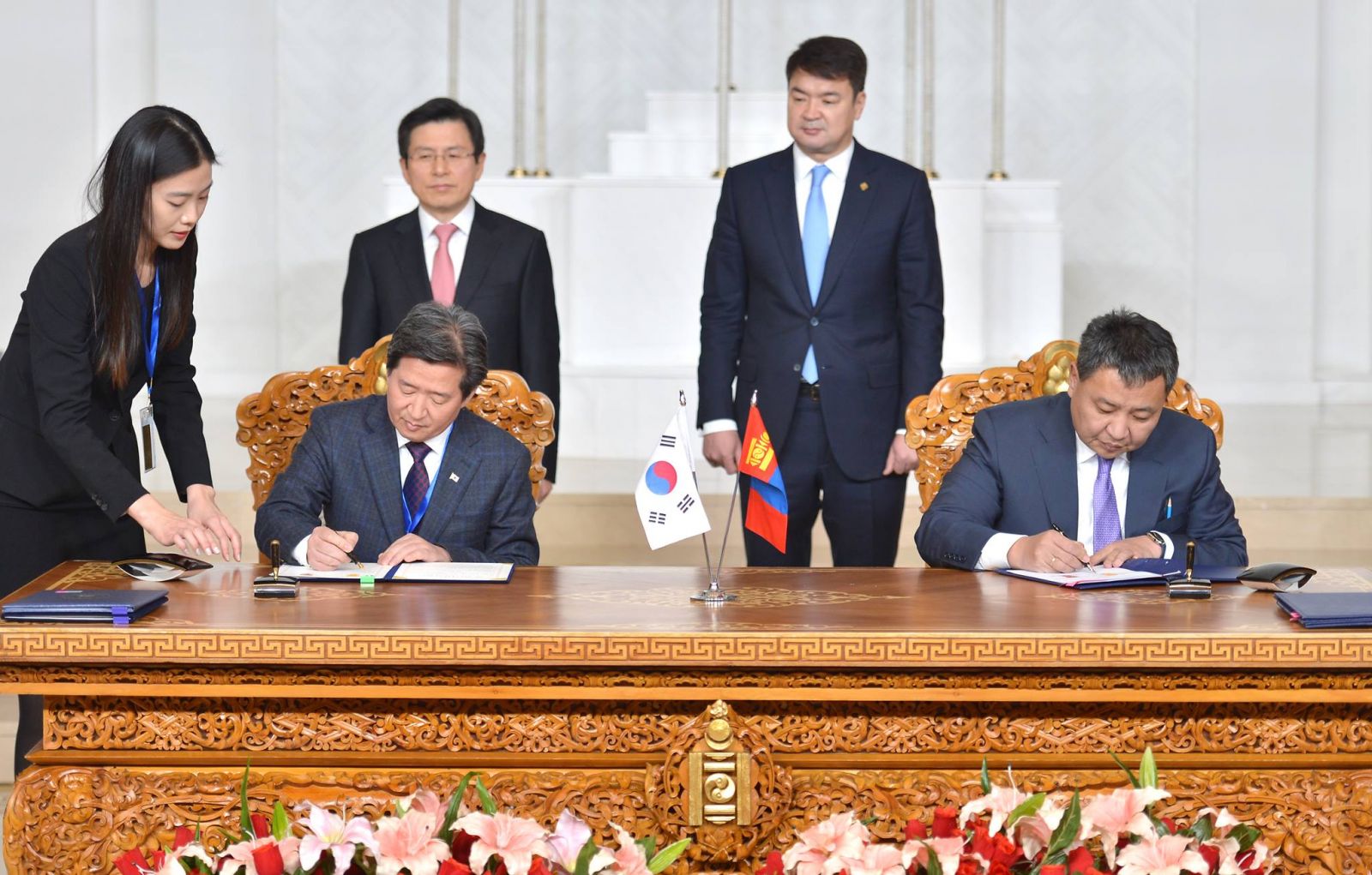 Монгол Улсын Ерөнхий сайд Ч.Сайханбилэгийн урилгаар Бүгд Найрамдах Солонгос Улсын Ерөнхий сайд Хван Гё Ан энэ сарын 15-17-нд Монгол Улсад албан ёсны айлчлал хийж байна. Ерөнхий сайд нар ганцаарчилсан уулзалт болон албан ёсны хэлэлцээ хийсний дараагаар баримт бичигт гарын үсэг зурах ёслолд оролцлоо.
