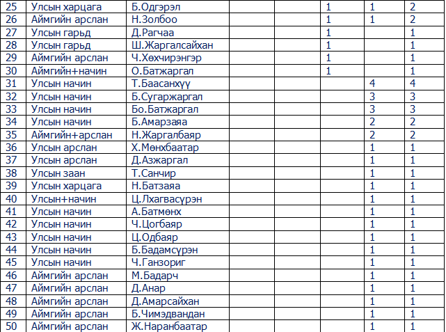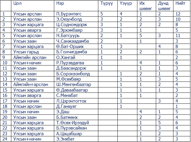 Улс, аймгийн алдар цолтой бөхийн энэ онд зодоглосон 23 барилдааны дараах байдлаар Увс аймгийн Давст сумын харьяат "Увснуур" дэвжээ "ДЦС-4" ТӨХК-ийн бөх, улсын арслан Пүрэвийн Бүрэнтөгс чансаагаараа тэргүүлж байна. Харин удаах байрт хэн, хэн багтсаныг дараах хүснэгтнээс харна уу.