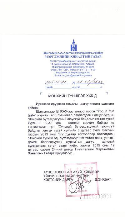 Шалгалтаар “Мөнхийн түншлэл” ХХК-ний БНХАУ-аас импортлосон “Yogurt fruit taste” нэрийн 450 граммаар савлагдсан цэлцэгнүүр нь “Хүнсний бүтээгдэхүүний аюулгүй байдлыг хангах тухай хууль”-н 10.3.1 дах заалтыг зөрчиж байгаа нь тогтоогдсон тул “Хүнсний бүтээгдэхүүний аюулгүй байдлыг хангах тухай хуулийн 8 дугаар зүйл, Засгийн газрын 2013 оны 172 дугаар тогтоолоор батлагдсан “Хүнсний түүхий эд, бүтээгдэхүүнийг татан авах, устгах, дахин боловсруулах журам”-ын дагуу хүнсний сүлжээнээс татан авалт хийлэгхээр шийдвэрлэж, 444 хайрцаг бүтээгдэхүүнийг битүүмжлэн, худалдаалтыг зогсоож, тухайн бүтээгдэхүүнээс дээж авч, лабораторын шинжилгээнд хамрууллаа.
