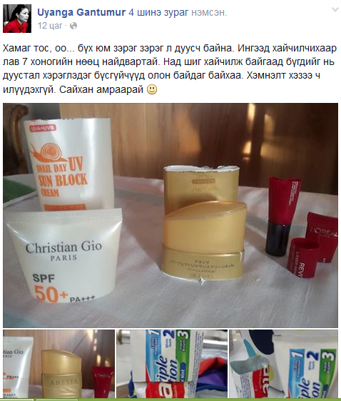 УИХ-ын гишүүн Г.Уянга өөрийн фэйсбүүк хуудаснаа гоо сайхны бүтээгдэхүүн болоод ахуйн хэрэглээний бүтээгдэхүүнүүдээ хэрхэн хэмнэдэг талаараа бичжээ. Тэрбээр нүүрний тос дуусахад савыг нь хоёр хуваагаад хэрэглэхэд дор хаяж долоо хоног хэрэглэх тос хананд нь байдаг тухай болоод дууссан оогоо хэрхэн үргэлжлүүлж хэрэглэдгээ ч хуваалцсан байна.