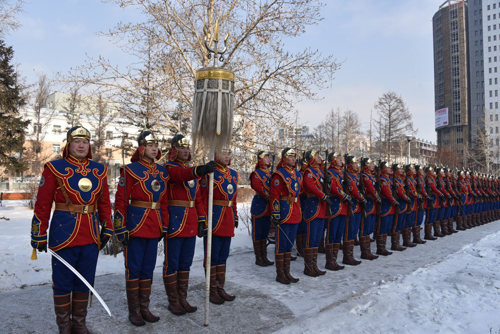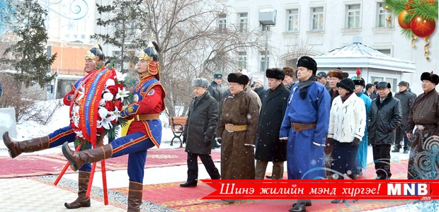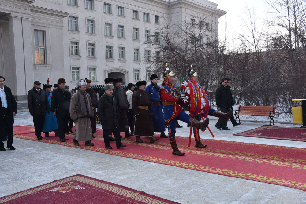 Монгол Улсын Ерөнхийлөгч Цахиагийн Элбэгдорж, Монгол Улсын Их Хурлын дарга Зандаахүүгийн Энхболд, Монгол Улсын Ерөнхий сайд Чимидийн Сайханбилэг нар Үндэсний эрх чөлөө, тусгаар тогтнолоо сэргээн тогтоосны түүхт 104 жилийн ойг тохиолдуулан өнөөдөр Төрийн ордны хойно байрлах Монгол төрийн тамганы хөшөөнд цэцэг өргөлөө.