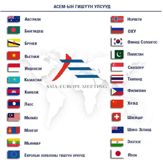 “АСЕМ” буюу “Ази-Европ” чуулга уулзалтад эгнээндээ зүүн ази болон европын орнуудыг багтаасан олон улсын байгууллага. АСЕМ-д дэлхийн худалдааны 2/3, дэлхийн дотоодын нийт бүтээгдэхүүний 60 орчим хувийг эзэлдэг 51 орон, Европын комисс, АСЕАН-ны нарийн бичгийн дарга нарын газар гэсэн олон улсын 2 байгууллага багтдаг.
