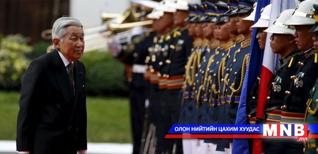 Японы эзэн хаан Акихито, хатан хаан Мичико нар Филиппин улсын Ерөнхийлөгч Бенигно Акиногийн урилгаар тус улсад албан ёсны айлчлал хийж байна. Өчигдөр орой Японы эзэн хаан хатны хамтаар Филиппиний нийслэл Манила хотод байрлах Ерөнхийлөгчийн ордонд тэдэнд зориулан зохион байгуулсан хүлээн авалтад оролцлоо.