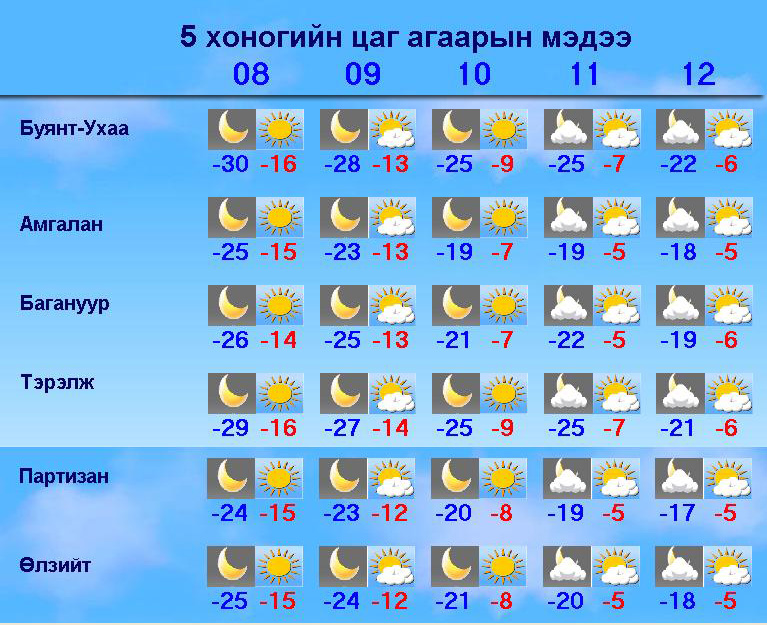 | Нийслэлийн цаг агаарын 5 хоногийн урьдчилсан мэдээ | ||
