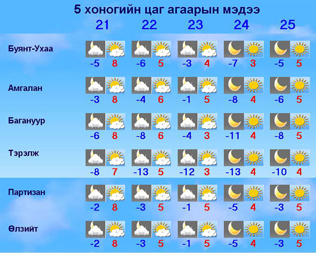 | Нийслэлийн цаг агаарын 5 хоногийн урьдчилсан мэдээ | ||