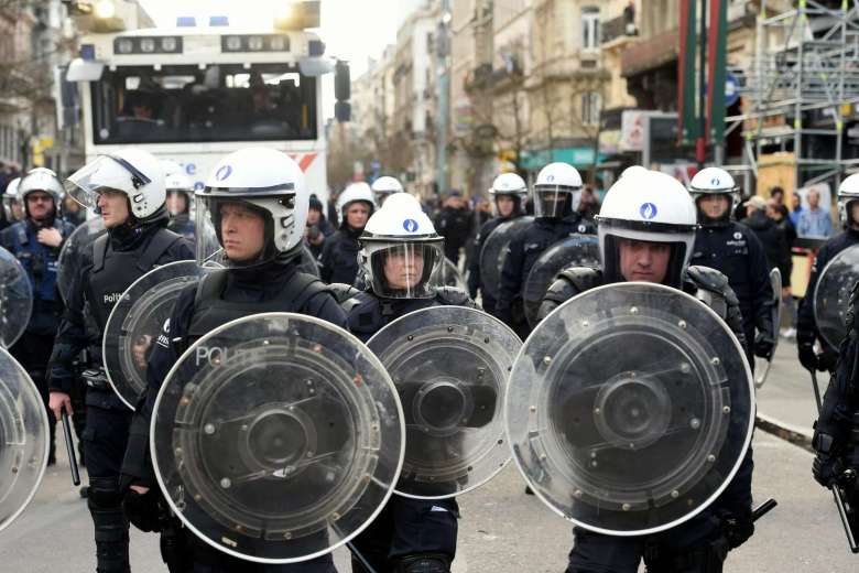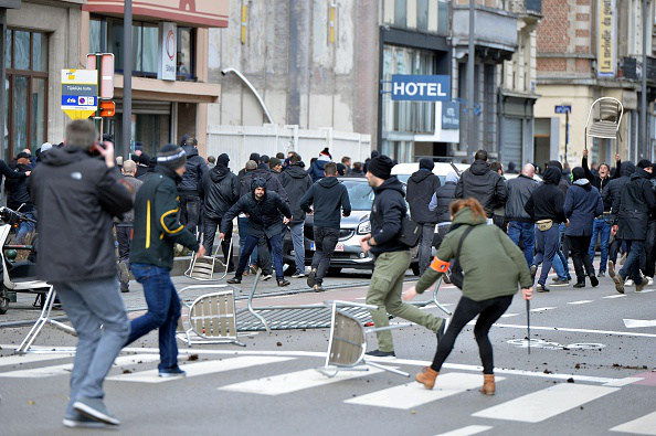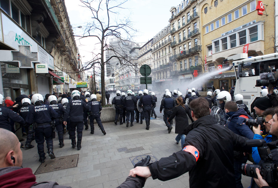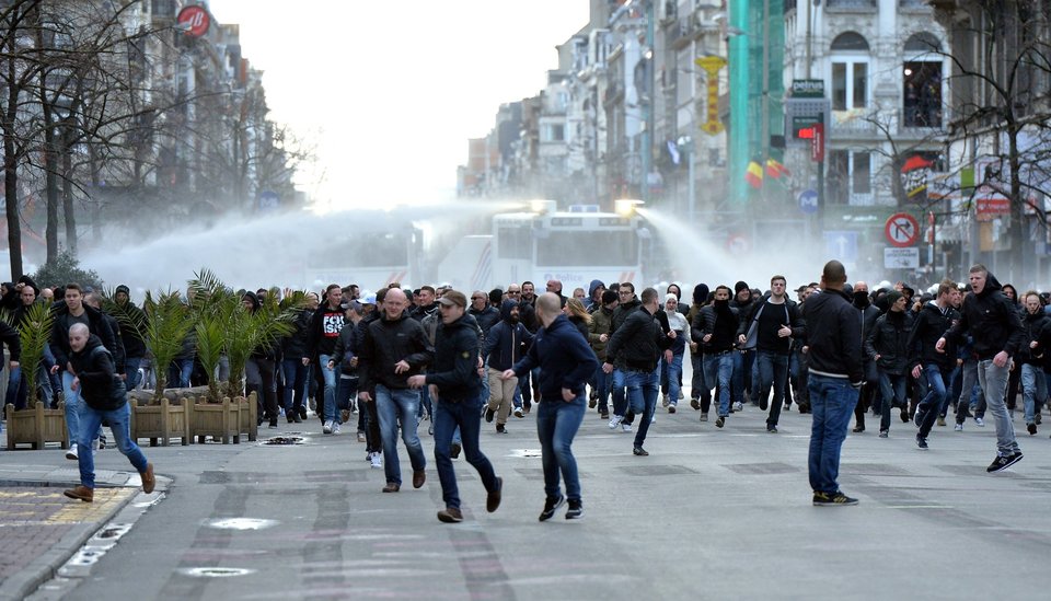 Цагдаа нар энэхүү бүлэг жагсагчдыг тараахын тулд даралтат ус шүршигч ашигласан байна. Эдгээр жагсагч хэт барууны үндсэрхэг үзэлтнүүд байсан гэж орон нутгийн хэвлэлүүд мэдээлж байгаа юм. Харин цагдаа нарын өгсөн мэдээллээр тайван жагсаалыг үймүүлсэн бүлэг дотор 340 орчим хүн байсан юм байна. Бельгийн хэд хэдэн бүс нутгийн хөлбөмбөгийн клубуудаас ирсэн эдгээр танхай этгээдийг тараах явцад хоёр цагдаа хөнгөн бэртэж гэмтсэн, мөн 10 орчим этгээдийг цагдаа нар баривчилсан байна.