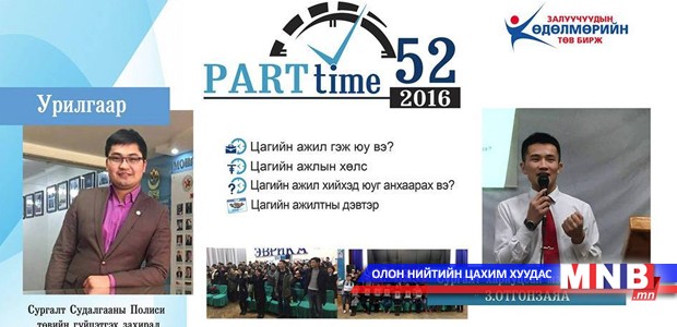 Мөн энэ үеэр Залуучуудын хөдөлмөрийн төв биржийн мэргэжилтэн З.Отгонзаяа цагийн ажил гэж юу вэ, цагийн ажлын хөлс, цагийн ажил хийхэд юу анхаарах вэ, цагийн ажилтны дэвтэр зэрэг сэдвээр цагийн ажил хайгч залууст мэдээлэл хүргэх аж. Сургалт, лекц МЗХ-ны Залуус танхимд 13 цагаас болох бөгөөд цагийн ажил хайж буй бүх залууст нээлттэйг дуулгалаа.