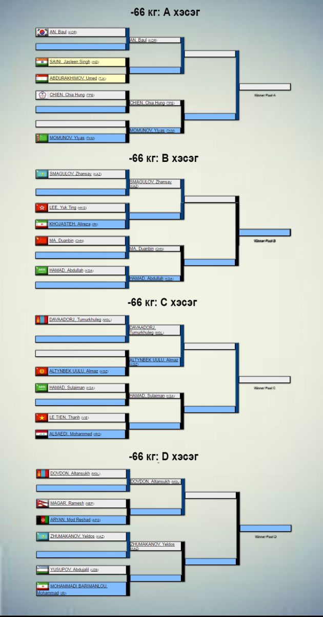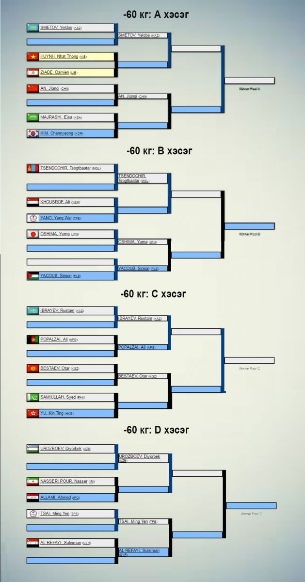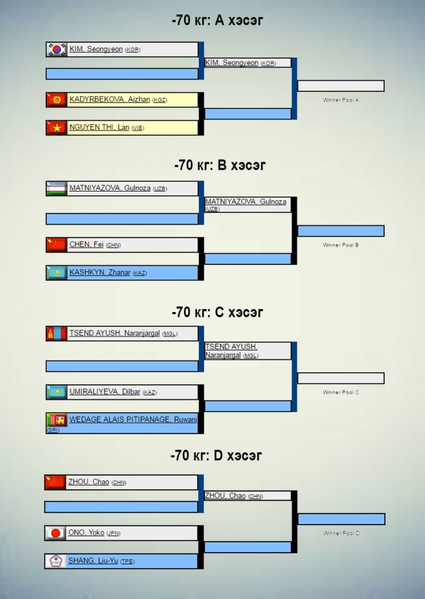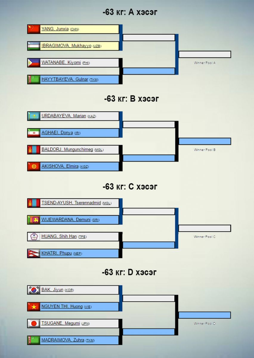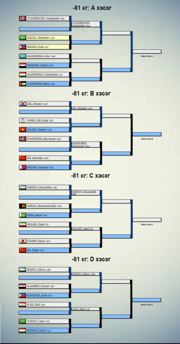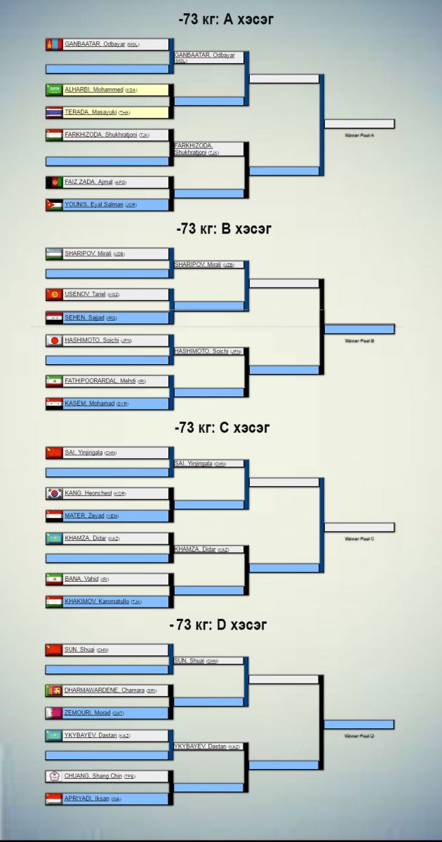 Жүдо бөхийн Азийн АШТ Узбекистаны нийслэл Ташкентад өнөөдөр эхэлнэ. Үүнд 31 орны 240 гаруй тамирчин оролцож буй бөгөөд манай улсаас эрэгтэй, эмэгтэй тус бүр бүр есөн цагаан өмсгөлтөн хүч үзнэ. Сугалааг доорх жагсаалтаас харна уу.