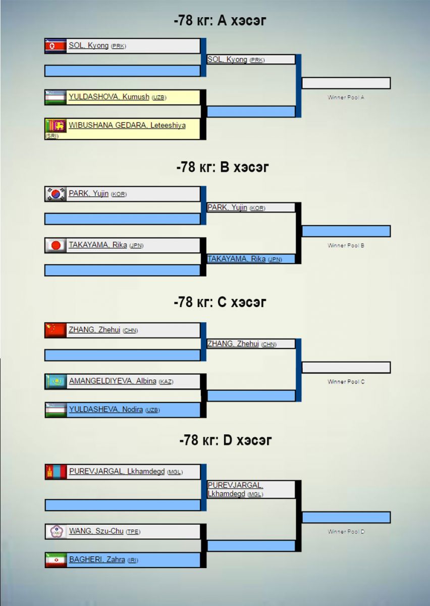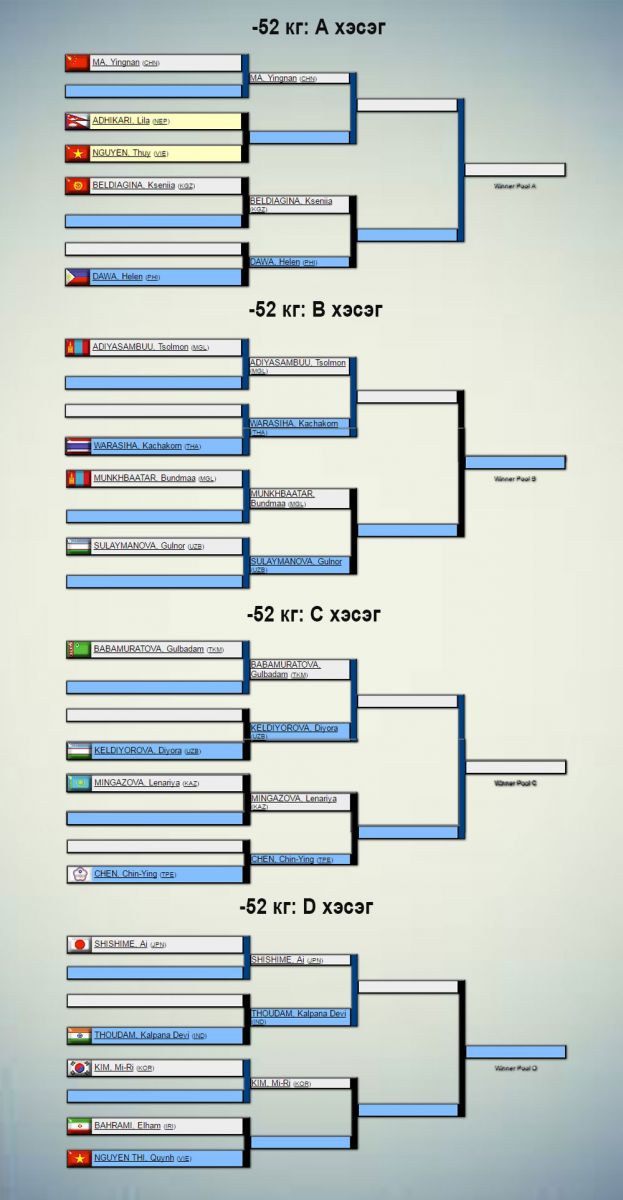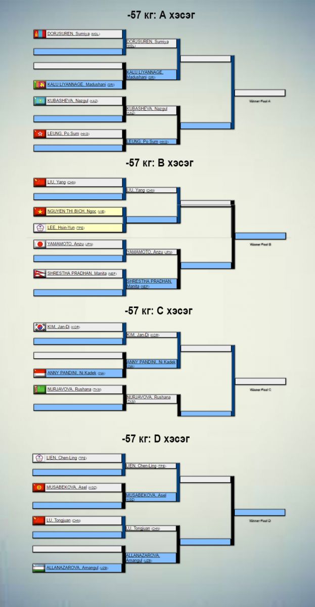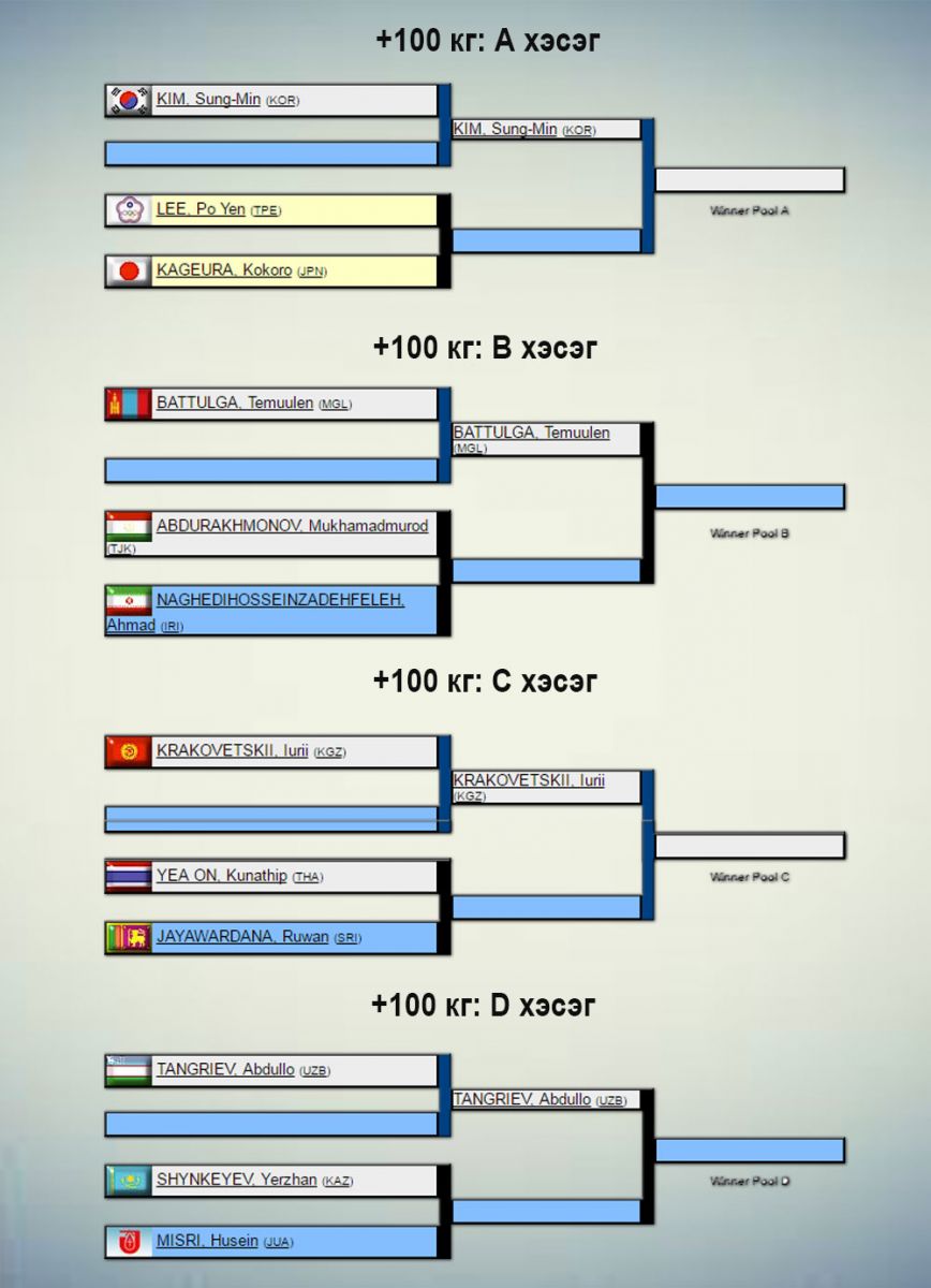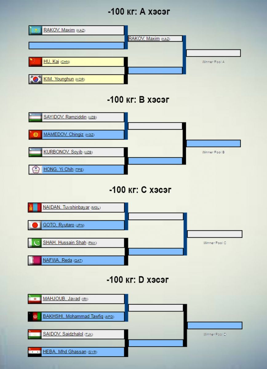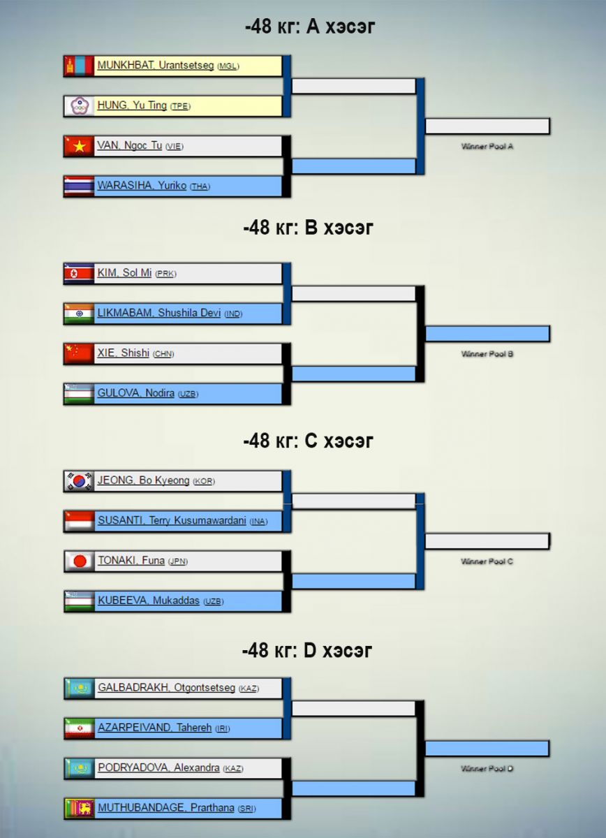Жүдо бөхийн Азийн АШТ Узбекистаны нийслэл Ташкентад өнөөдөр эхэлнэ. Үүнд 31 орны 240 гаруй тамирчин оролцож буй бөгөөд манай улсаас эрэгтэй, эмэгтэй тус бүр бүр есөн цагаан өмсгөлтөн хүч үзнэ. Сугалааг доорх жагсаалтаас харна уу.