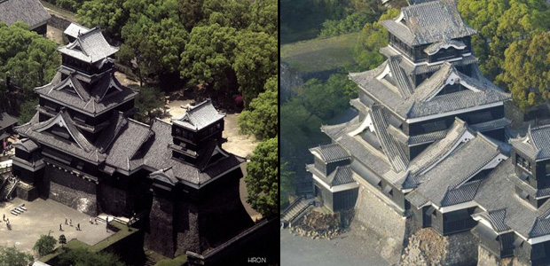 Харин сая болж өнгөрсөн газар хөдлөлтийн үед тус цайзыг хүрээлсэн 200 метр хэрмийн талаас илүү хувь нь нурж унасан байна. Хүчтэй газар хөдлөлтийн дараа газар дахин хэд хэдэн удаа чичрэх үзэгдлийг дайвар чичиргээ гэж нэрлэдэг. Кюүшюү аралд дайвар чичиргээ үргэлжилсээр байгаа талаар "Эн-Эйч-Кей" уламжилж байна. Хамгийн сүүлийн үеийн мэдээллээр 100 гаруй тооны ийм чичиргээ мэдрэгдсэний зарим нь өчигдөр орой болсон газар хөдлөлттэй дүйцэхүйц хэмжээний хүчтэй юм байна.