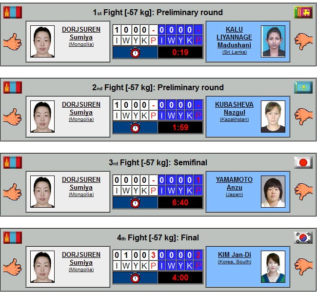 Жүдо бөхийн ААШТ-д эмэгтэйчүүдийн -57 кг-д хүч үзсэн Д.Сумъяа алтан медаль хүртлээ. Ингэснээр тэрбээр дээрх тэмцээнээс 15 дахь алтан медалиа зүүж буй юм.