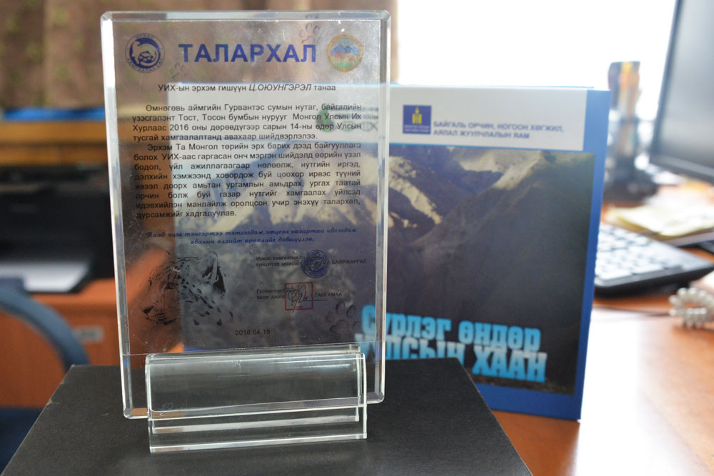 Эрхэм Та Монгол төрийн эрх барих дээд байгууллага болох Улсын Их Хурлаас гаргасан онц мэргэн шийдэлд өөрийн үзэл бодол, үйл ажиллагаагаар нөлөөлж, нутгийн иргэд, дэлхийн хэмжээнд ховордож буй цоохор ирвэс түүний ивээл доорх амьтан ургамлын амьдрах, ургах таатай орчин болж буй газар нутгийг хамгаалах үйлсэд идэвхийлэн манлайлж оролцсон учир энэхүү талархал, дурсамжийг хадгалуулав.