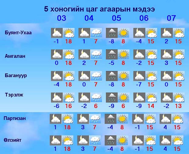 | Нийслэлийн цаг агаарын 7 хоногийн урьдчилсан мэдээ | ||