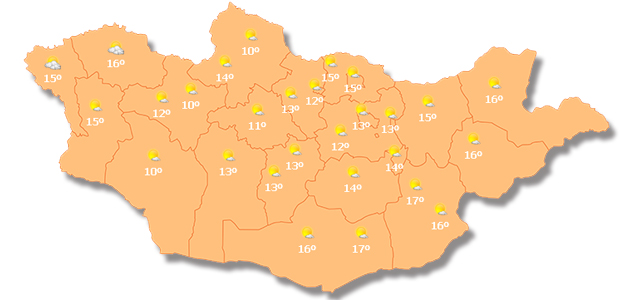 УЛААНБААТАР ХОТ: Үүлшинэ. Хур тунадас орохгүй. Салхи зүүн өмнөөс секундэд 5-10 метр, зарим үед 12-14 метр хүрч зөөлөн шороон шуурга шуурна. 17-19 хэм дулаан байна.