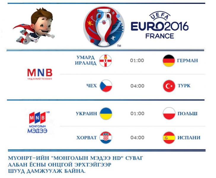 Энэ өдрүүдэд Франц улсад 15 дахь удаагаа болж буй Европын аварга шалгаруулах "Евро-2016" тэмцээнийг МҮОНРТ-ийн "Монголын Мэдээ" суваг албан ёсны онцгой эрхтэйгээр үзүүлж байгаа. Энэ удаад үзэгч та бүхэнд 01.00 цагт Умард Ирланд-Германы шигшээ багууд, 04.00 цагт Чех-Туркийн шигшээ багуудын тоглолтыг шууд хүргэж байна.