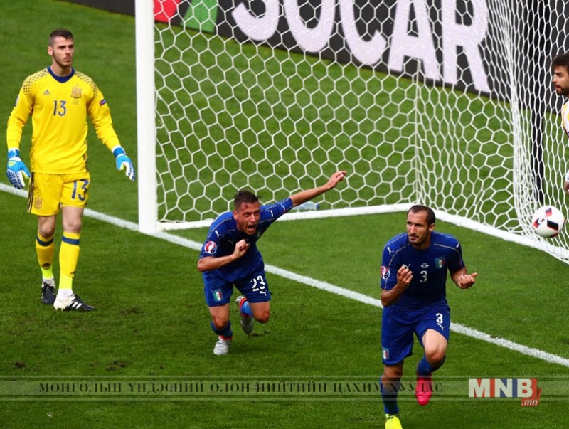 Тоглолтын 32 дахь минутад Италийн шигшээ баг чөлөөт цохилтыг хаалганаас 22 метрийн зайнаас цохих эрхтэй болсон бөгөөд цохилтыг Эдэр Мартинс хийхэд хаалгач Дэ Хеа хаасан хэдий ч ойж гарч ирсэн бөмбөгийг төвийн хамгаалагч Ж.Кьеллини нэмсэнээр Италичууд эхний үеийг тэргүүлж дуусгалаа.