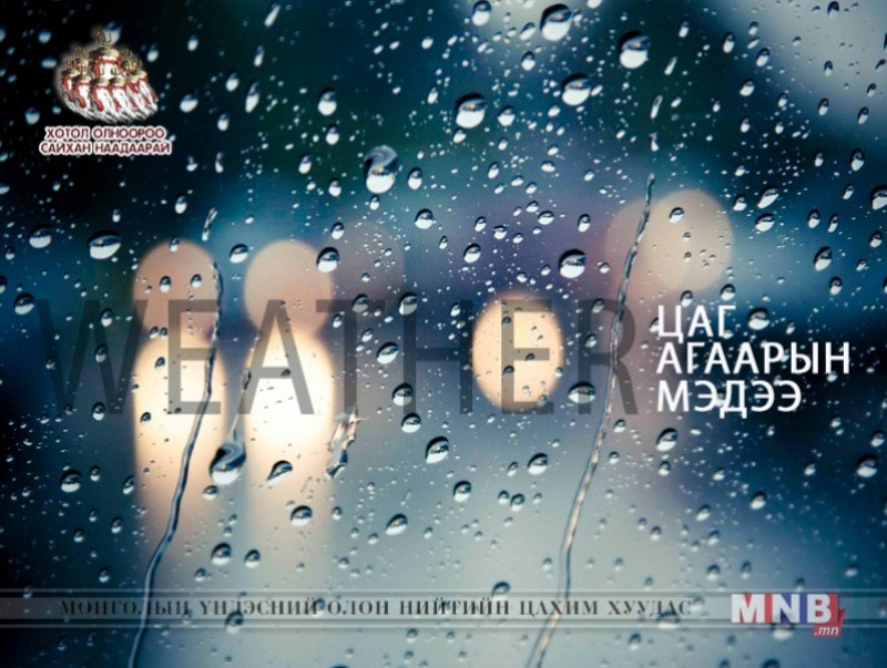 ТӨВИЙН АЙМГУУДЫН НУТГААР: Үүлшинэ. Шөнөдөө нутгийн баруун хэсгээр, өдөртөө ихэнх нутгаар бороо орно. Дуу цахилгаантай. Салхи баруун өмнөөс хойш эргэж секундэд 5-10 метр, зарим газраар секундэд 14-16 метр хүрч ширүүснэ. Хангай, Хөвсгөлийн уулархаг нутгаар шөнөдөө 8-13 хэм, өдөртөө сэрүүсч 13-18 хэм, Сэлэнгэ, Туул, Тэрэлж голын саваар шөнөдөө 15-20 хэм, өдөртөө 26-31 хэм, бусад нутгаар шөнөдөө 11-16 хэм, өдөртөө 20-25 хэм дулаан байна.